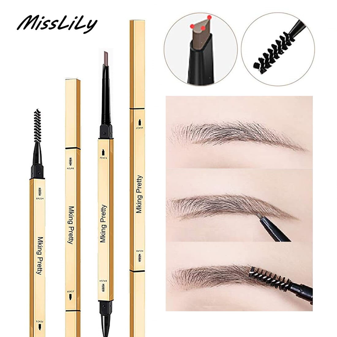 Precyzyjnie zakończona końcówka tworzy cienkie linie imitujące włoski, umożliwia piórkowanie oraz wypełnienie brwi. Szczoteczka pomaga nadać im odpowiedni kształt. Dzięki przyjemnej teksturze łatwo rozprowadza się wzdłuż włosków i pozostaje na nich przez długi czas. Makijaż pozostaje trwały i odporny na ścieranie. Gama kolorystyczna odpowiednia dla każdego typu urody.
