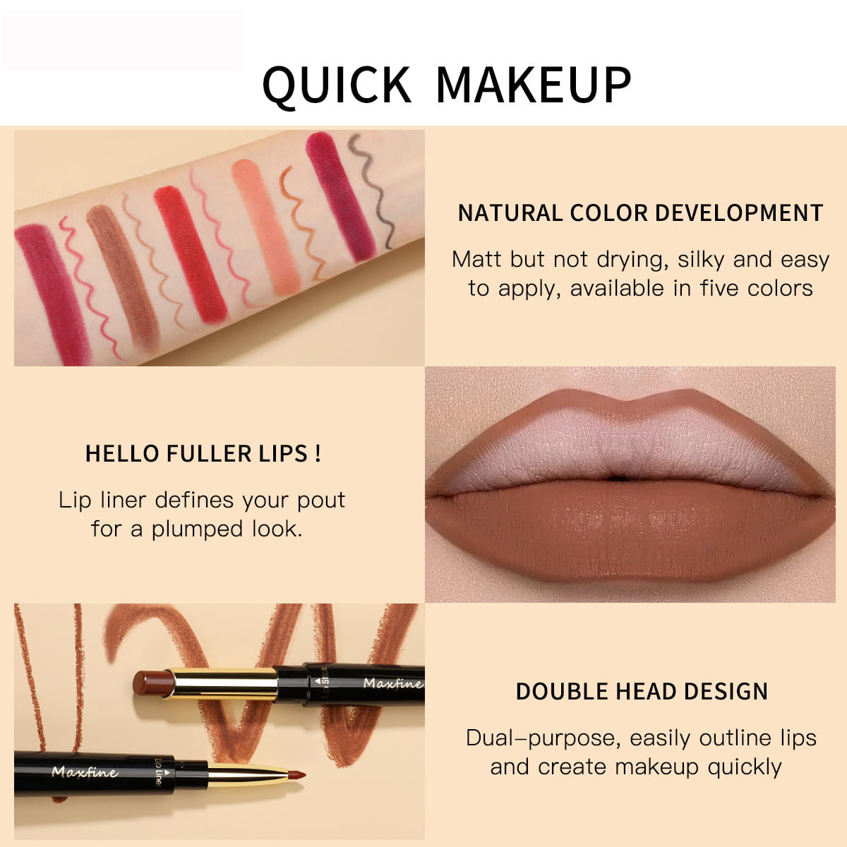 Wodoodporna gładka konturówka i pomadka do ust. Dzięki miękkiej konsystencji ta długotrwała konturówka do ust jest idealna do kształtowania ust, co uwydatnia usta, równoważy nierówności w kształcie ust, zapobiega rozmywaniu się szminki i błyszczyka Nie przykleja się do kubka, nie blaknie, matowe aksamitne wykończenie, długotrwałe i wodoodporne, wysoce napigmentowane, zapewnia doskonały wygląd makijażu przez cały dzień Ten produkt może być nie tylko używany jako szminka, ale może być również używany jako eyeliner, cień do powiek lub róż.