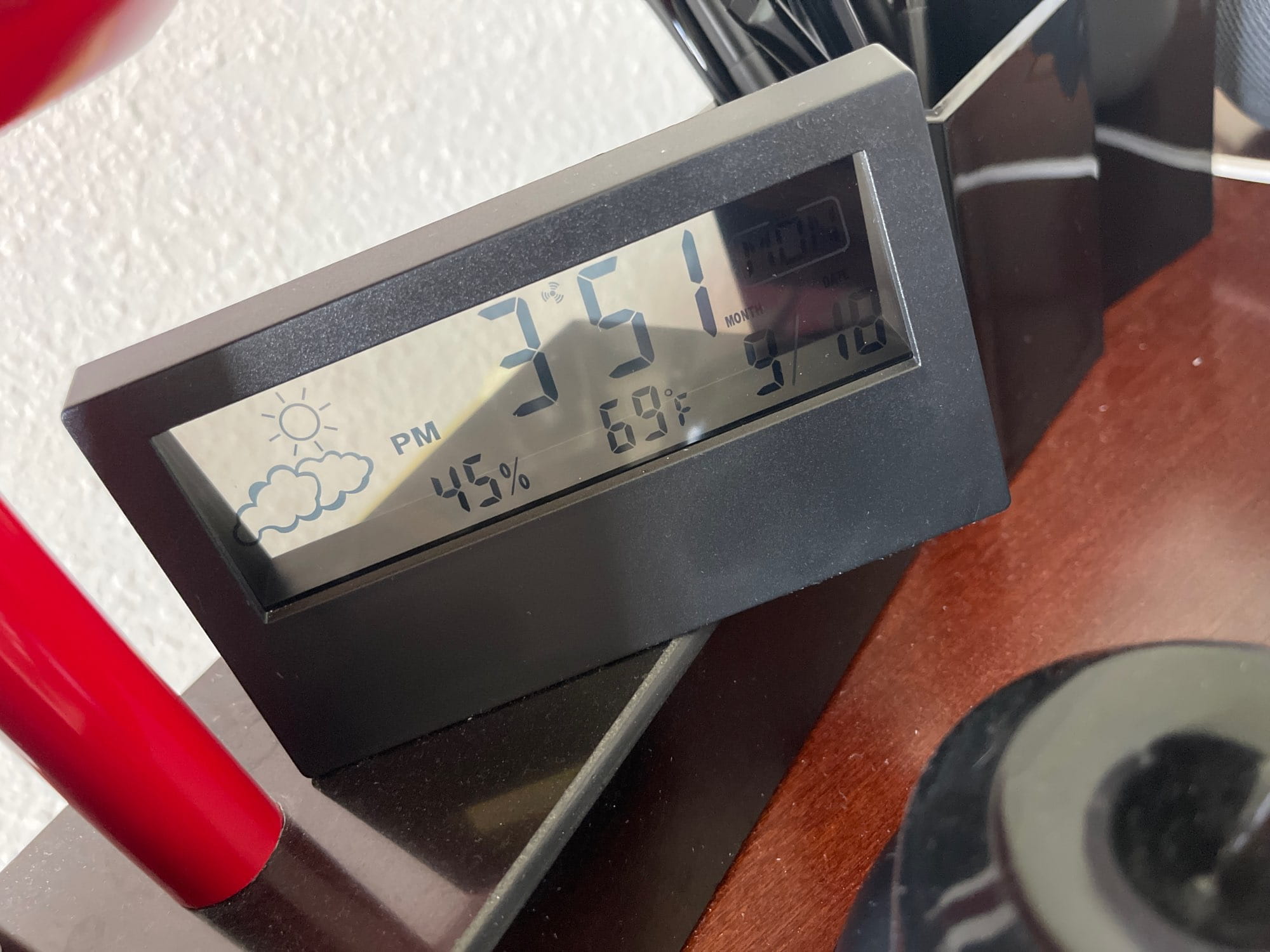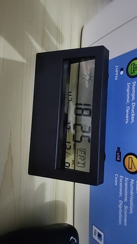 Wyświetlacz LCD :Zegar posiada łatwy do odczytania wyświetlacz LCD, który pokazuje godzinę, datę i temperaturę.